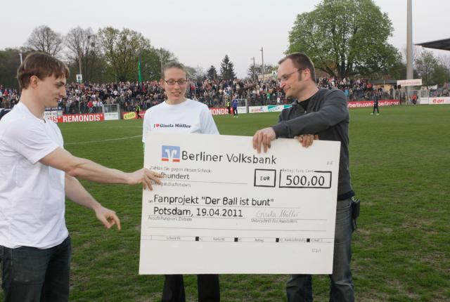 Der Fanbeauftragte Jens Lüscher hat stellvertretend für die Fans vom SV Babelsberg 03 am 19.4.2011 in der Halbzeitpause des fantastischen Spiels Babelsberg gegen Jena (4:1) den Scheck über 500 Euro von Gisela Müllers Enkeln in Empfang genommen. Die Spenden kommen dem antirassistischen Stadionfest „Der Ball ist bunt“ zu Gute.